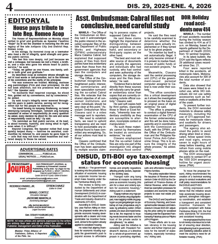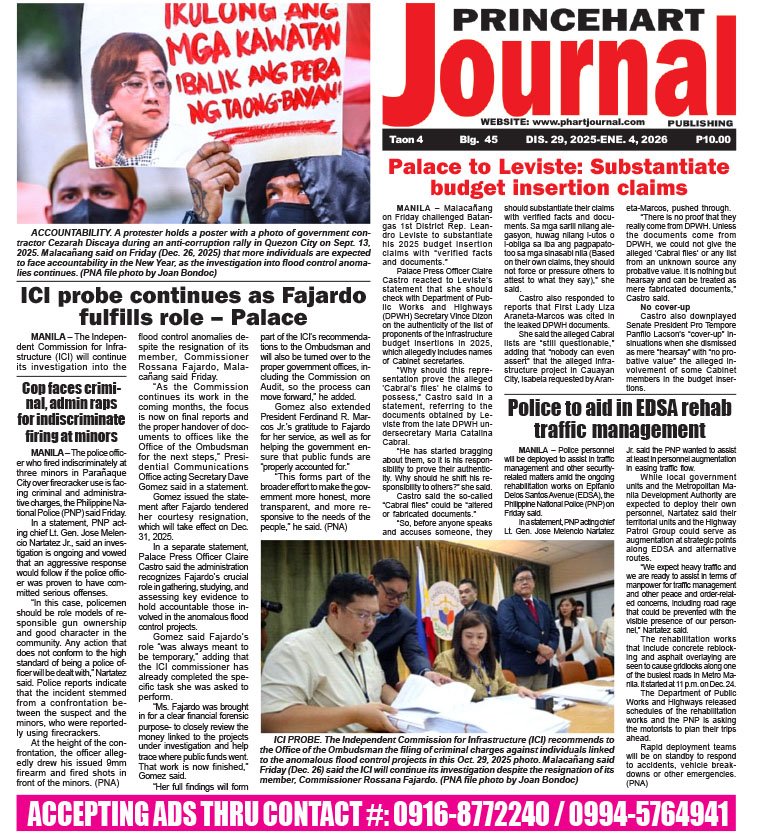 Cover story Latest Princehart Journal issue files PJP DECEMBER 29, 2025- JANUARY 4, 2026 Princehart journal news team December 29, 2025 Continue Reading Previous Previous post: PJP December 22-28, 2025Next Next post: PJP January 5-11, 2026 Leave a Reply Cancel replyYour email address will not be published. Required fields are marked *Comment * Name * Email * Website Save my name, email, and website in this browser for the next time I comment. Related News PJP January 26- Feb. 1, 2026 January 25, 2026 PJP Jan 19-25, 2026 January 18, 2026